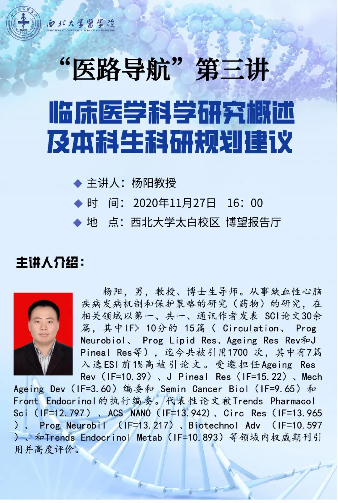 2020年11月27日,学院邀请学部教授、博士生导师、2020级生物医学科学班班主任杨阳为mg冰球突破试玩全体学生做“临床医学科学研究概述及本科生科研规划建议”学术报告。本次讲座旨在指导医学生深入了解科学研究的目的和方法、进一步理解临床研究的重要性,指导学生树立严谨的科研态度,引导学生尽早尽快找准方向,走上科研探索之路。